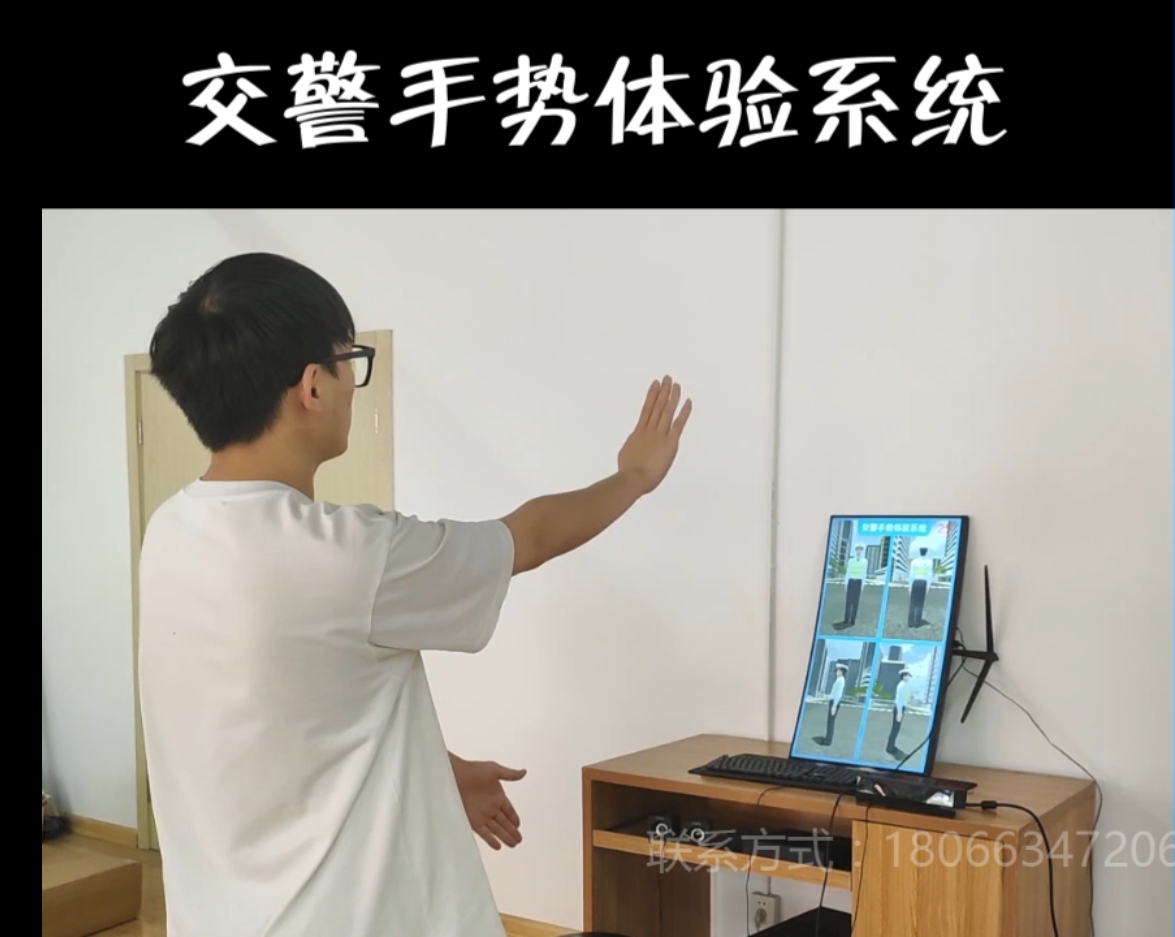 交警手勢互動體驗系統(tǒng)主要采用體感骨骼跟蹤技術(shù)以及Unity3D進行開發(fā),能夠精準(zhǔn)識別用戶的手勢特征。系統(tǒng)內(nèi)一共有8個不同的交警手勢以及模擬的交通場景,并且支持24小時不間斷運行。 具體操作用戶走進識別區(qū)域內(nèi),根據(jù)系統(tǒng)頁面提示開始操作。頁面中央顯示30s倒計時,左下角顯示標(biāo)準(zhǔn)的手勢動作,右下角為體感器識別的人體手勢動作結(jié)果,并有文字提示:請參照標(biāo)準(zhǔn)手勢。系統(tǒng)中的8個手勢隨機不重復(fù)出現(xiàn),用戶需要在30s內(nèi)做出對應(yīng)的手勢。