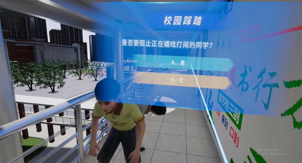 場景是學生在參加集體活動下樓梯時發(fā)生的踩踏事故,通過對引起踩踏事故的各種原因進行分析,體驗不同的形式,從而讓學生能夠更加重視,避免這類事故的發(fā)生。