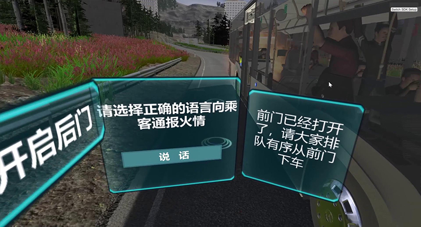 4-1、體驗者通過位移靠近客車前門位置,通過手柄觸碰拾取駕駛座右手邊角落處的滅火器及警示標志,畫面出現(xiàn)UI提示“滅火器與警示標志已拾取”;