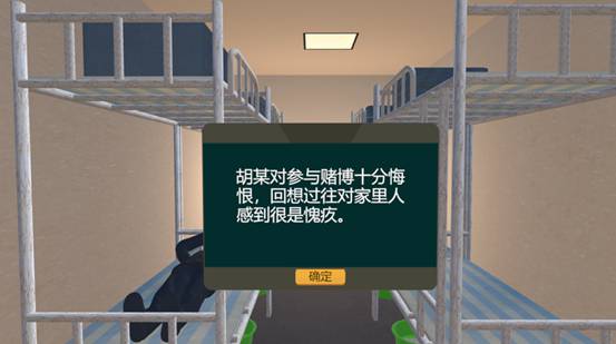 本系統(tǒng)以社區(qū)矯正人員胡某參與賭博的視角。進(jìn)行了胡某朋友拉人賭博,胡某女兒進(jìn)行勸阻,胡某置之不理參與賭博,賭博時(shí)被捕,被捕后深深懊悔,釋放后被催債,后來(lái)妻離子散,感到整個(gè)世界都崩塌了的體驗(yàn)。