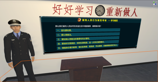 在三維場(chǎng)景里講解法律條款,讓服刑人員學(xué)習(xí)《憲法》、《刑法》、《刑事訴訟法》、《民法典》、《監(jiān)獄法》等基本法律以及與自身關(guān)系密切的法律常識(shí),并且服刑人員學(xué)習(xí)后與智慧考核答題系統(tǒng)聯(lián)動(dòng),以評(píng)估其效果。