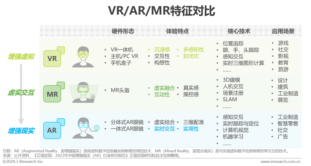 虛擬現(xiàn)實(shí)概念源于科幻小說(shuō),由任天堂等游戲廠商開(kāi)啟商業(yè)化之路。早期設(shè)備成本高,技術(shù)成熟度有限,游戲廠商的嘗試都宣告失敗。2016年是虛擬現(xiàn)實(shí)的元年,硬件巨頭消費(fèi)級(jí)產(chǎn)品的推出,疊加中國(guó)眾多VR創(chuàng)企大力進(jìn)軍硬件端與內(nèi)容端,短期市場(chǎng)呈爆炸式增長(zhǎng)。但行業(yè)整體處于民用初期,受內(nèi)容稀缺、設(shè)備易眩暈、屏幕清晰度差等影響,消費(fèi)級(jí)市場(chǎng)整體發(fā)展放緩。伴隨行業(yè)技術(shù)日趨成熟與產(chǎn)業(yè)玩家的擴(kuò)容,行業(yè)在2020-2022年邁入發(fā)展的關(guān)鍵階段,Quest銷量迎消費(fèi)級(jí)拐點(diǎn)。2023年蘋(píng)果Vision Pro發(fā)布,其對(duì)全新交互方式的實(shí)踐為業(yè)內(nèi)玩家?guī)?lái)新的思考。作為現(xiàn)階段頂配產(chǎn)品,Vision Pro的出現(xiàn)不僅極大拉動(dòng)虛擬現(xiàn)實(shí)產(chǎn)業(yè)玩家信心,同時(shí)在市場(chǎng)激起的“浪花”,為行業(yè)帶來(lái)更多關(guān)注。艾瑞認(rèn)為,在可預(yù)見(jiàn)的27~28年,蘋(píng)果二代甚至三代產(chǎn)品將貢獻(xiàn)下一個(gè)里程碑,為產(chǎn)業(yè)帶來(lái)新的爆發(fā)。