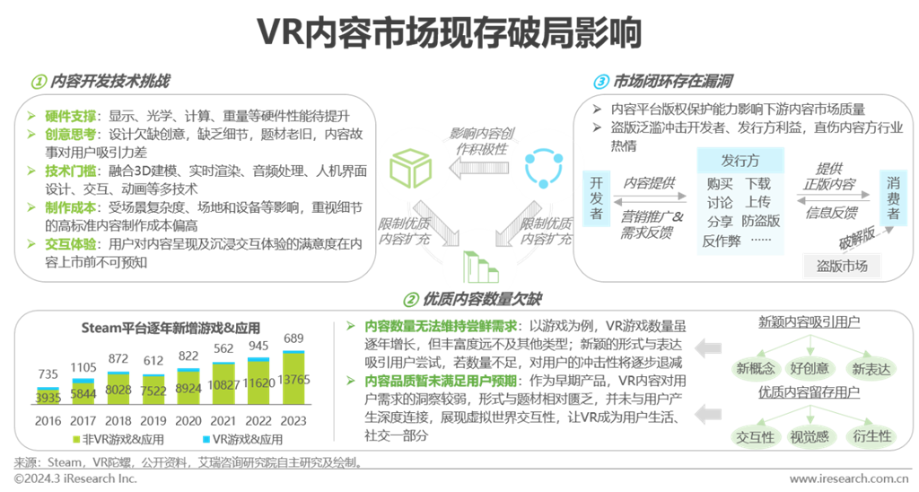 內(nèi)容側(cè):開(kāi)發(fā)技術(shù)限制優(yōu)質(zhì)內(nèi)容創(chuàng)作輸出,加之內(nèi)容市場(chǎng)環(huán)境成熟度欠缺,優(yōu)質(zhì)正版內(nèi)容難以獲得有效保護(hù),反向沖擊創(chuàng)作者信心,內(nèi)容市場(chǎng)閉環(huán)待完善