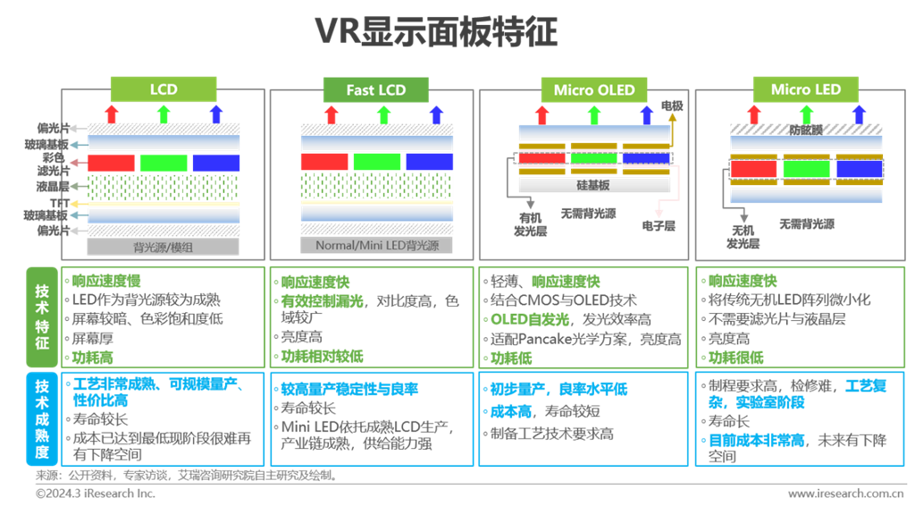 早期VR頭顯大部分采用LCD,礙于LCD響應(yīng)速度慢,從2016年起,玻璃基OLED被嘗試應(yīng)用于VR設(shè)備中。當(dāng)前的VR設(shè)備主要采用Fast LCD屏幕,該類型顯示屏在響應(yīng)速度、量產(chǎn)穩(wěn)定性、良率與成本等方面均有所改善。伴隨顯示方案的步步迭代,2022年起,VR產(chǎn)業(yè)頭部企業(yè)開(kāi)始研發(fā)帶有Mini LED的Fast LCD顯示面板與Micro OLED面板,以求在對(duì)比度、刷新率、亮度、光效等方面獲得進(jìn)一步提升。顯示屏亮度與對(duì)比度的提升,更好的適配了Pancake光學(xué)方案對(duì)高亮度的需求。值得一提的是,相較于Micro OLED的性能優(yōu)勢(shì),Micro LED在屏幕輕薄度、光效、顯示性能等方案更為出色,目前以蘋(píng)果、三星為首的企業(yè)正積極布局,是未來(lái)VR顯示面板的理想選擇。