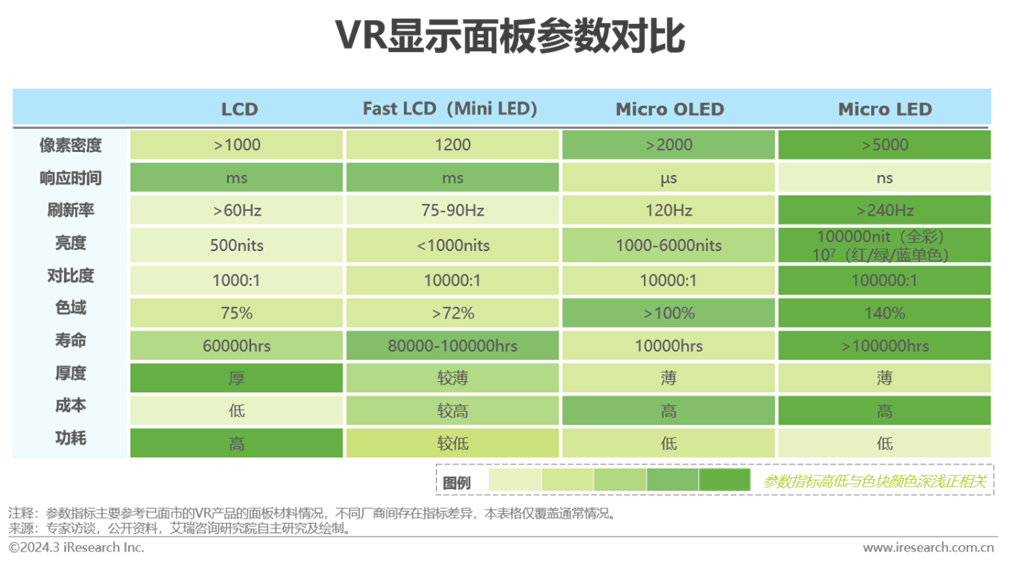 作為VR頭顯近期的主流選擇,F(xiàn)ast LCD(Mini LED)依托全新液晶材料與超速驅(qū)動(dòng)技術(shù),有效提升刷新率至75-90Hz。相較傳統(tǒng)LCD屏幕,F(xiàn)ast LCD兼顧提高屏幕亮度和對(duì)比度,增強(qiáng)對(duì)暗部區(qū)域顯示的控制,提高飽和度。Micro OLED在分辨率與刷新率方面的優(yōu)勢(shì)性能可分別有效緩解紗窗效應(yīng)與余暉效應(yīng),降低眩暈感對(duì)用戶體驗(yàn)的負(fù)面影響。盡管OLED長(zhǎng)時(shí)間顯示靜止畫(huà)面存在燒屏可能,但VR畫(huà)面通常會(huì)隨著佩戴者頭部運(yùn)動(dòng)而變化,畫(huà)面多數(shù)處于變化中,燒屏問(wèn)題可得到緩解。Micro LED具備絕對(duì)亮度與對(duì)比度優(yōu)勢(shì),相同功耗下可提供更長(zhǎng)久的續(xù)航。綜合多維度信息,F(xiàn)ast LCD與Micro OLED將在短期內(nèi)不斷滲透,特別是Micro OLED,量產(chǎn)后規(guī)模效應(yīng)下成本將下降。而各維度更勝一籌的Micro LED,待巨量轉(zhuǎn)移和全彩化方案等技術(shù)瓶頸突破后,在VR頭顯有望實(shí)現(xiàn)全面搭載。