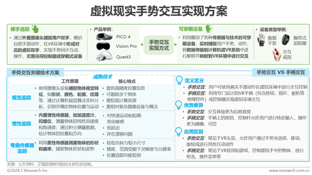 VR設(shè)備的手勢(shì)交互技術(shù)發(fā)展較為緩慢,裸手交互和可穿戴設(shè)備交互仍處于初期階段。針對(duì)不同應(yīng)用場(chǎng)景,VR廠商的交互方案各有側(cè)重,如Meta Quest系列的裸手交互基于計(jì)算機(jī)視覺(jué)獲取數(shù)據(jù),用戶可快速體驗(yàn)裸手效果;HTC VIVE則依靠腕式追蹤器,通過(guò)慣性傳感器提高手勢(shì)交互的準(zhǔn)確性與可靠性。為了平衡裸手交互的沉浸感與手柄交互的高準(zhǔn)確性,廠商們開(kāi)始嘗試基于慣性傳感器或彎曲傳感器的數(shù)據(jù)手套方式。目前手勢(shì)交互更迭中需克服的難點(diǎn)主要來(lái)自(1)算法層面的數(shù)據(jù)質(zhì)量:保證數(shù)據(jù)質(zhì)量和一致性;(2)手勢(shì)關(guān)鍵點(diǎn)的識(shí)別精度:確保數(shù)據(jù)實(shí)時(shí)高效,優(yōu)化演繹模型;(3)交互設(shè)計(jì)的友好性:規(guī)避視覺(jué)死角,提升交互體驗(yàn)。