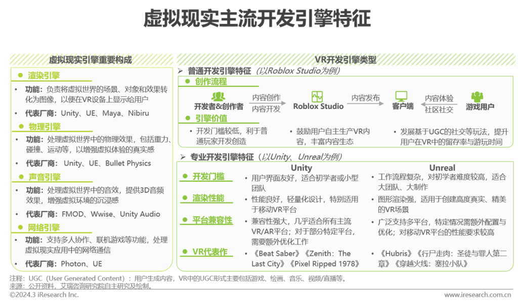 引擎平臺(tái)將軟件系統(tǒng)分解為若干功能模塊,以此來(lái)提高軟件開(kāi)發(fā)效率、降低開(kāi)發(fā)成本并增強(qiáng)軟件系統(tǒng)的可拓展性。VR產(chǎn)品強(qiáng)調(diào)交互體驗(yàn),開(kāi)發(fā)前期需要實(shí)驗(yàn)驗(yàn)證,確保核心設(shè)計(jì)點(diǎn)符合VR場(chǎng)景。目前應(yīng)用于VR的開(kāi)發(fā)引擎以Unity和Unreal為主,在物理模型創(chuàng)建、圖像渲染、系統(tǒng)渲染等方面具備良好性能,因?yàn)樵擃愋烷_(kāi)發(fā)引擎具備一定使用難度,主要供程序員、開(kāi)發(fā)者等專業(yè)人員使用。近兩年來(lái)VR行業(yè)玩家均在積極推進(jìn)內(nèi)容生態(tài)的構(gòu)建,加之元宇宙產(chǎn)業(yè)的迅速發(fā)展和AIGC刮起的新一輪科技熱潮,企業(yè)鼓勵(lì)普通用戶自主生產(chǎn)內(nèi)容,并提供開(kāi)發(fā)門(mén)檻較低的創(chuàng)作工具,激發(fā)玩家進(jìn)行UGC創(chuàng)作,同步強(qiáng)化內(nèi)容與社交生態(tài)。