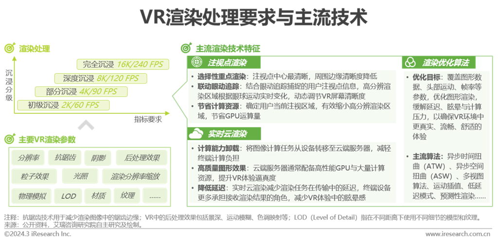渲染處理主要涉及(1)內(nèi)容渲染:在VR環(huán)境中創(chuàng)建、生成各種元素、場(chǎng)景、對(duì)象與效果和(2)終端渲染:對(duì)生成的內(nèi)容進(jìn)行畸變、色散等校正并呈現(xiàn)到用戶終端設(shè)備。為匹配用戶的進(jìn)階需求,當(dāng)前的VR渲染處理已跨越初級(jí)階段向部分沉浸階段邁進(jìn),在畫(huà)質(zhì)、速度、成本等多方面尋求質(zhì)量與效率間的平衡。相較于普通的3D渲染,VR渲染注重用戶體驗(yàn)的全方位性,在幀率、延遲、交互控制、立體聲視圖、性能優(yōu)化等方面均有更高要求。作為連接用戶與虛擬環(huán)境的橋梁,渲染在VR中扮演重要角色,需要高規(guī)格硬件算力設(shè)備、成熟的XR可穿戴智能終端、優(yōu)化的渲染算法及逐步系統(tǒng)化的云渲染模式等技術(shù)的協(xié)同推動(dòng)。當(dāng)前階段,得益于眼動(dòng)追蹤技術(shù)的成熟,注視點(diǎn)渲染吸引更多業(yè)內(nèi)玩家嘗試,如Quest Pro、PS VR 2、PICO 4 Pro等越來(lái)越多的VR設(shè)備已在產(chǎn)品中配置。AI算法的成熟應(yīng)用,為渲染模型提供大量圖像、視頻數(shù)據(jù),VR場(chǎng)景質(zhì)量更為逼真。云化架構(gòu)將渲染能力導(dǎo)入云端,云邊協(xié)同有助于降低終端配置成本,改善時(shí)延、抖動(dòng)等問(wèn)題。在硬件算力仍有不足的情況下,ATW、ASW等優(yōu)化算法也成為VR產(chǎn)品標(biāo)配,以降低虛擬世界的渲染復(fù)雜性,進(jìn)而緩解延遲與滯后。