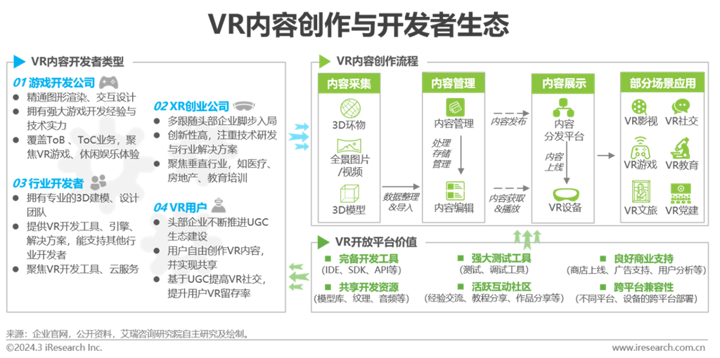 VR/AR內(nèi)容服務(wù)是虛擬現(xiàn)實(shí)產(chǎn)業(yè)鏈中較為復(fù)雜的一環(huán),由內(nèi)容制作與內(nèi)容分發(fā)兩部分構(gòu)成。其中,內(nèi)容制作指創(chuàng)建用于虛擬現(xiàn)實(shí)環(huán)境的數(shù)字內(nèi)容,包括圖像、視頻、音頻、社交元素等,覆蓋游戲、影視、社交、直播、教育、房產(chǎn)家居、3D全景等多維度;內(nèi)容分發(fā)則是將制作好的VR內(nèi)容傳遞給最終用戶的過(guò)程,使用戶可在VR設(shè)備上訪問(wèn)、體驗(yàn)內(nèi)容。目前VR內(nèi)容的開(kāi)發(fā)主體主要由VR游戲企業(yè)、XR企業(yè)和3D應(yīng)用企業(yè)構(gòu)成。在硬件終端不斷突破的基礎(chǔ)上,行業(yè)玩家將構(gòu)建內(nèi)容生態(tài)作為戰(zhàn)略重點(diǎn),紛紛推出VR開(kāi)發(fā)者平臺(tái)或VR開(kāi)放平臺(tái);該種集成了開(kāi)發(fā)環(huán)境和資源的平臺(tái)為VR創(chuàng)作者提供了全面的開(kāi)發(fā)工具,方便開(kāi)發(fā)者獲取、共享資源并可在不同VR設(shè)備上進(jìn)行應(yīng)用測(cè)試,進(jìn)而確保各場(chǎng)景與設(shè)備上的穩(wěn)定性。創(chuàng)作門(mén)檻的降低,吸引了更多VR用戶參與內(nèi)容創(chuàng)作,用戶可通過(guò)社區(qū)互動(dòng)分享作品、加強(qiáng)交流。互動(dòng)性激發(fā)用戶創(chuàng)作熱情,疊加部分平臺(tái)的獎(jiǎng)勵(lì)機(jī)制,促進(jìn)優(yōu)質(zhì)內(nèi)容產(chǎn)出,用戶同時(shí)享受到更加豐富的虛擬體驗(yàn)。