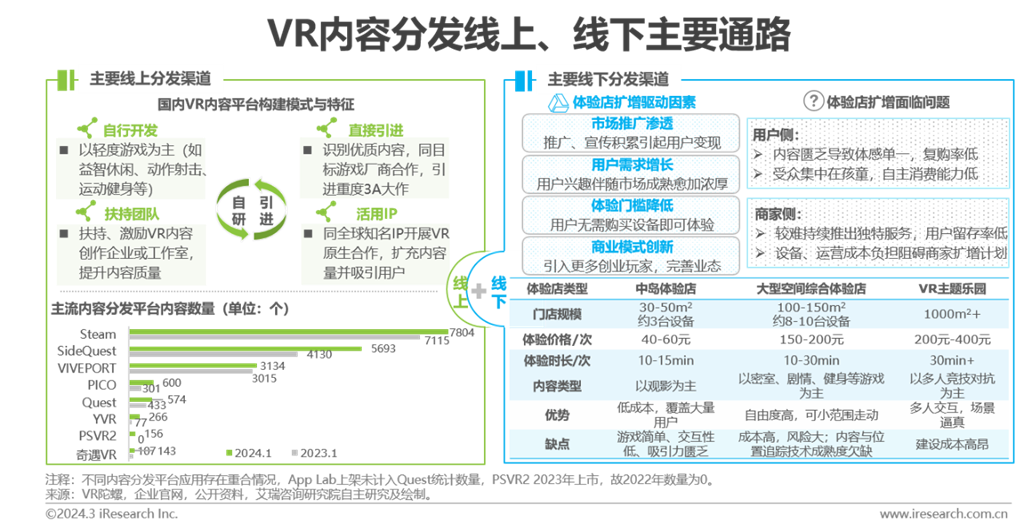 內(nèi)容分發(fā)平臺(tái)打破內(nèi)容碎片化,聚合的豐富內(nèi)容可匹配用戶不同興趣與需求。內(nèi)容分發(fā)渠道分為:(1)線上:由內(nèi)容分發(fā)平臺(tái)主導(dǎo),為用戶提供在線購(gòu)買(mǎi)、下載和體驗(yàn)服務(wù)。目前線上分發(fā)渠道以各硬件廠商自行搭建為主,暫未出現(xiàn)第三方內(nèi)容分發(fā)平臺(tái)布局。從內(nèi)容數(shù)量角度,國(guó)外平臺(tái)占主導(dǎo)地位,其中Steam作為傳統(tǒng)游戲平臺(tái),憑借多年積累優(yōu)勢(shì),VR內(nèi)容數(shù)量一路領(lǐng)跑;國(guó)內(nèi)VR應(yīng)用商店加速追趕,盡管內(nèi)容體量仍無(wú)法同海外頭部廠商抗衡,但通過(guò)自研與引進(jìn)兩種模式,內(nèi)容量快速擴(kuò)充。數(shù)量并非絕對(duì)標(biāo)志,但多樣選擇為呈現(xiàn)優(yōu)質(zhì)內(nèi)容提供更大可能。(2)線下:多指B to C線下游藝門(mén)店,以VR體驗(yàn)店為主。伴隨疫情開(kāi)放,線下娛樂(lè)由停滯狀態(tài)開(kāi)始不斷回溫,逐漸受到更多關(guān)注;如能有效緩解用戶與商家側(cè)面臨問(wèn)題,VR體驗(yàn)店有望成為VR產(chǎn)品出貨的重要支撐。