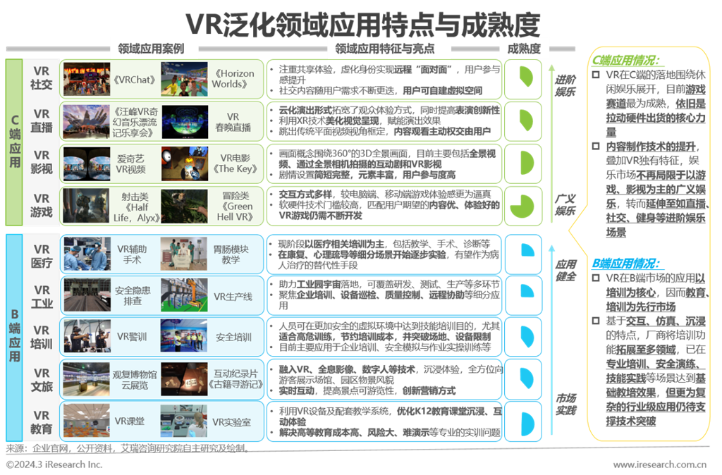 場(chǎng)景應(yīng)用:C端與B端同步發(fā)力,由基礎(chǔ)場(chǎng)景實(shí)踐如游戲、影視、文旅,向更為全面的進(jìn)階場(chǎng)景,如社交、工業(yè)、醫(yī)療延伸