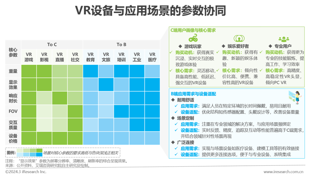 對(duì)于消費(fèi)級(jí)領(lǐng)域,游戲是VR在C端落地最早且相對(duì)成熟的場(chǎng)景,VR游戲用戶的行業(yè)教育程度最深,導(dǎo)致其對(duì)VR產(chǎn)品及服務(wù)的敏感性增強(qiáng)。行業(yè)后續(xù)衍生的C端場(chǎng)景中,直播、社交等聚焦動(dòng)態(tài)與實(shí)時(shí)交互的細(xì)分應(yīng)用對(duì)響應(yīng)時(shí)長(zhǎng)、交互質(zhì)量更為關(guān)注。VR影視更多依賴預(yù)先開(kāi)發(fā)內(nèi)容,應(yīng)用重點(diǎn)在于展示。對(duì)于行業(yè)級(jí)領(lǐng)域,工業(yè)、醫(yī)療等技術(shù)門(mén)檻高的場(chǎng)景較為關(guān)注VR設(shè)備的可操作性,因而與應(yīng)用效果直接關(guān)聯(lián)的各項(xiàng)參數(shù),均為該場(chǎng)景的關(guān)注重點(diǎn)。在教育、培訓(xùn)等場(chǎng)景,VR技術(shù)與產(chǎn)品的應(yīng)用價(jià)值多體現(xiàn)為對(duì)行業(yè)工作模式的創(chuàng)新改革,領(lǐng)域用戶對(duì)VR技術(shù)、服務(wù)性能容忍度更高。