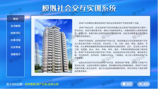 模擬社會(huì)交互實(shí)訓(xùn)系統(tǒng)具備6種模擬業(yè)務(wù)辦理知識(shí),涵蓋民政、房產(chǎn)、公證、工商、司法所及派出所等關(guān)鍵社會(huì)服務(wù)領(lǐng)域,每個(gè)模塊均細(xì)分為5個(gè)子部分,分別是繪聲繪影、業(yè)務(wù)認(rèn)知、法律講堂、隨堂測驗(yàn)、聯(lián)系直通車,旨在通過多角度、多層次的交互體驗(yàn),深化服刑人員對(duì)每一個(gè)業(yè)務(wù)流程的理解和掌握。
