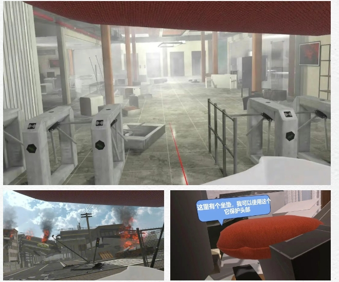 我司開發(fā)的“VR辦公室地震系統(tǒng)”、“VR校園地震系統(tǒng)”高度還原地震發(fā)生時的場景,并結(jié)合震動平臺還原地震發(fā)生的情景,讓體驗者在感到地震眩暈感晃動感的同時,根據(jù)提示進行自救行為,提高災(zāi)害應(yīng)對能力。