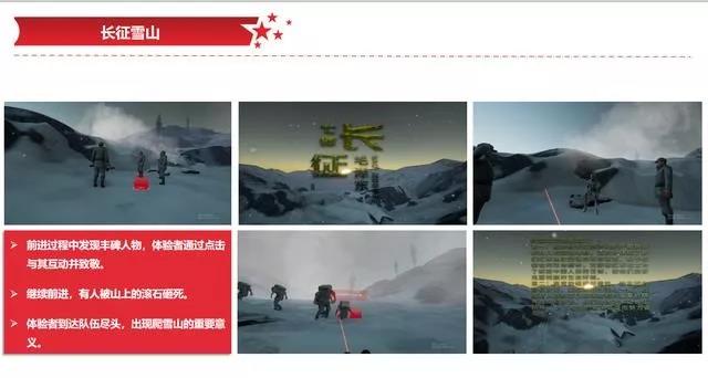 工作人員戴上VR眼鏡,可以重溫長征路,體驗當(dāng)年農(nóng)軍爬雪山的艱難。在雪山體驗場景里,你將扮演一名紅軍戰(zhàn)士,在行進過程中遇見戰(zhàn)友滑到,遇見體力不支餓暈在路旁的同志,還會遇見教科書本上為了革命而犧牲的軍需處長。這些原本在教課書上發(fā)生的故事情節(jié),通過VR我們蹦栩栩如生在眼前展示。
