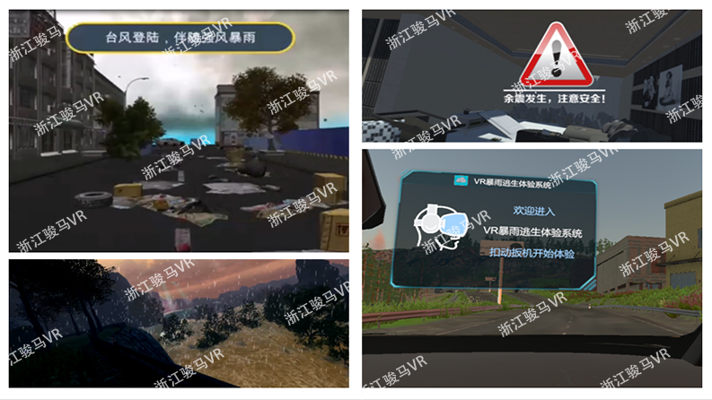 自然災(zāi)害體驗(yàn)系統(tǒng)中包含了“VR泥石流災(zāi)害自救與逃生”、“VR臺(tái)風(fēng)天氣預(yù)防”、“VR暴風(fēng)雨逃生演練系統(tǒng)”、“VR地震逃生體驗(yàn)”等。讓體驗(yàn)者在各不同場景中學(xué)習(xí)如何應(yīng)對自然災(zāi)害等突發(fā)事件,如何進(jìn)行安全預(yù)防避險(xiǎn)等安全知識(shí)。